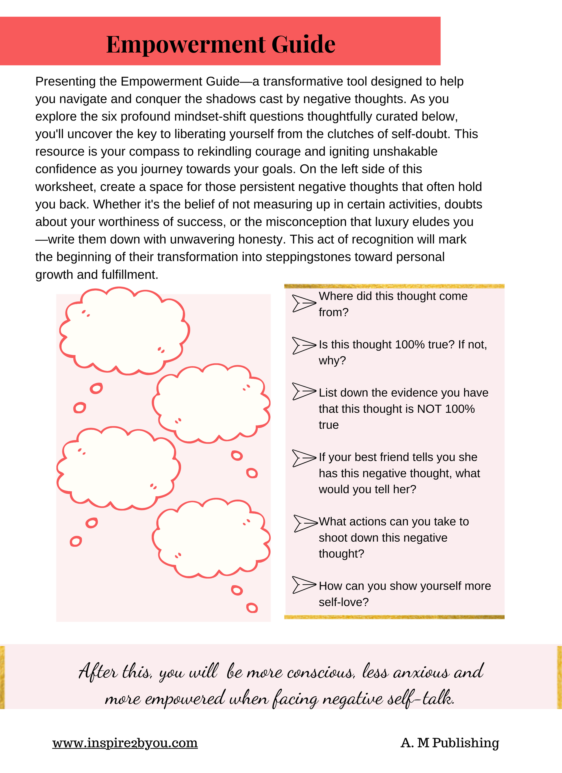Unlock your inner strength with our 6-page 8 x 11in. empowerment guide. This focused resource is dedicated to helping you break free from the chains of negative self-talk and channel your energy toward self-improvement. Discover effective techniques and strategies that will empower you to transform your mindset, boost self-confidence, and embark on a journey of self-growth. Say goodbye to self-doubt and hello to a more empowered you. Download your guide today and take the first step toward a brighter, more confident future.