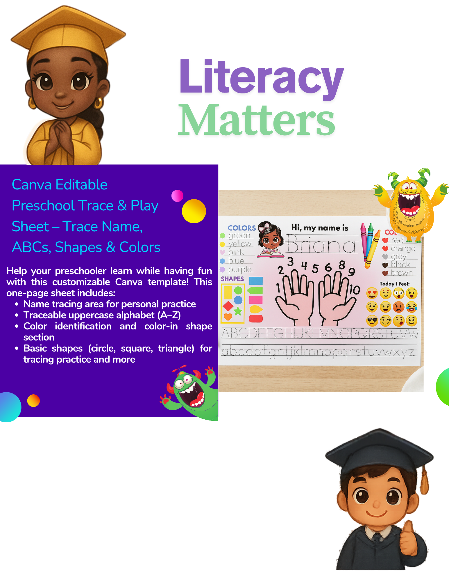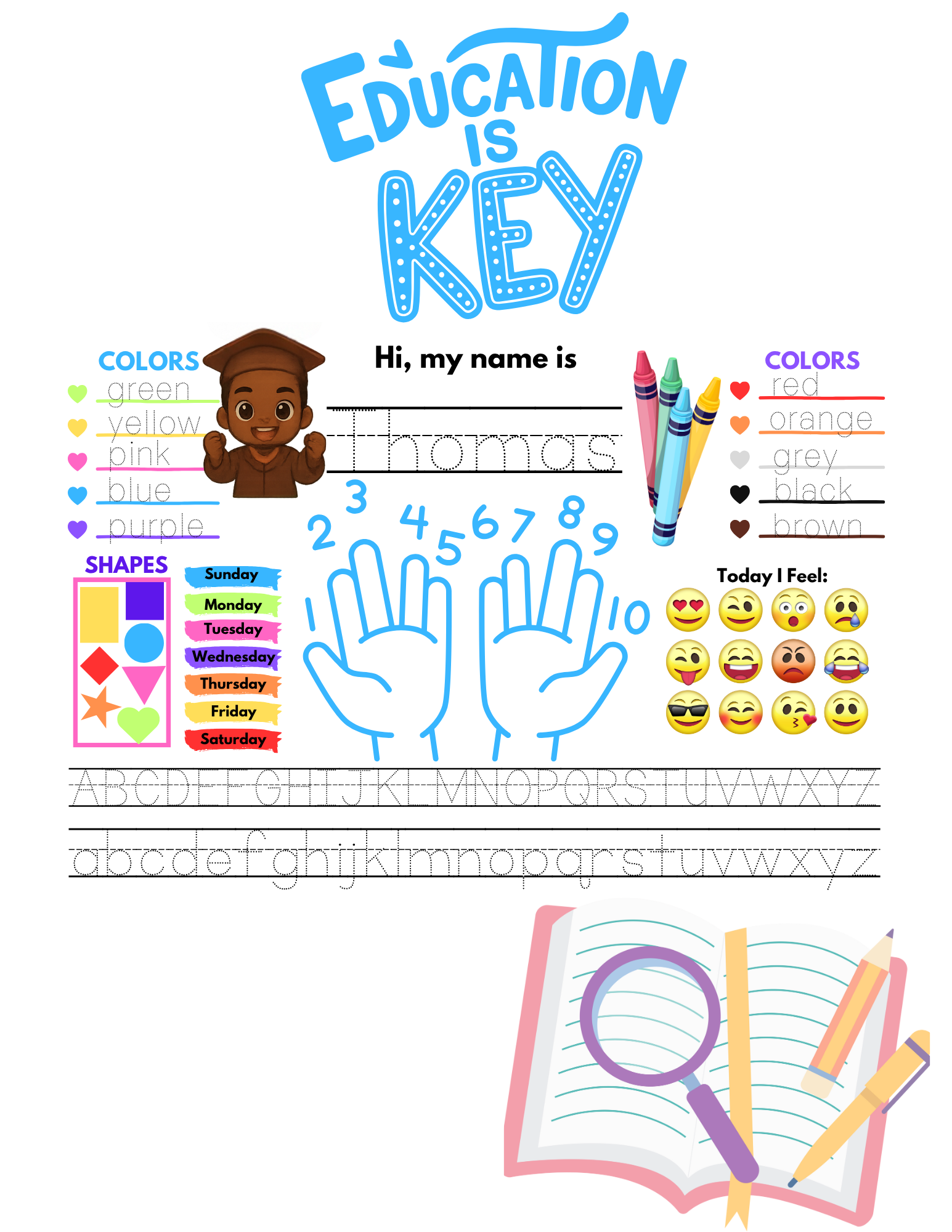 ✔️ Includes traceable letters, colors, and a name section